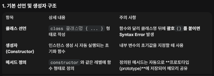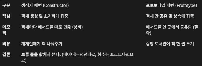 ※ 엄밀히 말해 자바스크립트의 Class 문법은 생성자 패턴(객체 초기화)과 프로토타입 패턴(메서드 메모리 공유)이 결합된 형태이다. 이 포스팅에서는 편의상 객체를 생성하는 관점에 집중하여 ‘생성자 패턴’으로 통칭하여 설명했다.