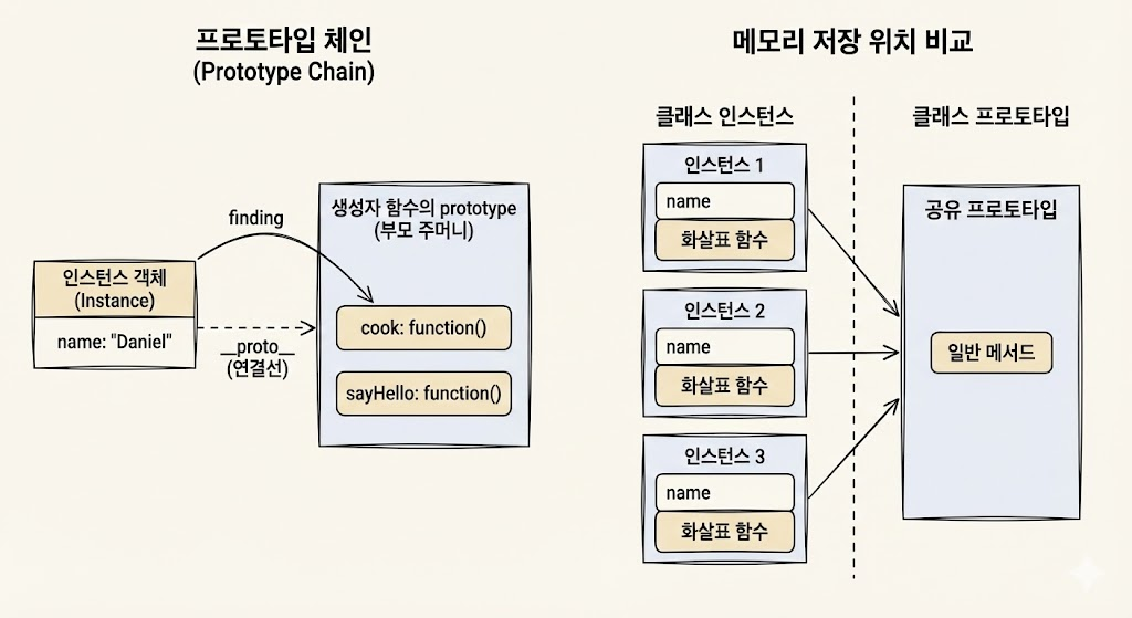 클래스 내부에서 화살표 함수로 메서드를 정의하면, 부모의 프로토타입에 저장되지 않고 인스턴스 개별 본체에 각각 정의된다. 인스턴스를 만들 때마다 동일한 함수가 계속 생성되므로, 인스턴스가 아주 많아질 경우 메모리 효율은 일반 메서드보다 떨어진다. 즉, 화살표 함수를 쓰면 **프로토타입 패턴(공유)**을 포기하고, 순수한 **생성자 패턴(개별 소유)**으로 돌아간다