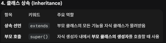 클래스의 상속은 extends 키워드로 가능하며, 부모의 생성자를 호출하고 싶은 경우 super()를 사용한다.
