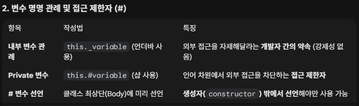 클래스 내부 변수를 만들 때의 관례는 외부에서 접근하지 않을 변수의 경우 변수명 앞에 _(언더바)를 붙이는 것이다. 만약 C언어의 private 처럼 절대 외부에서 접근하지 못하게 하려면, 접근제한자인 #을 변수명 앞에 붙이면 된다. 접근제한자를 붙인 변수는 생성자 밖에 선언해야한다.